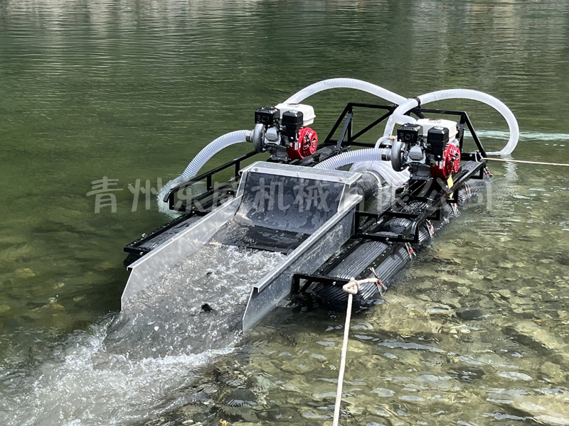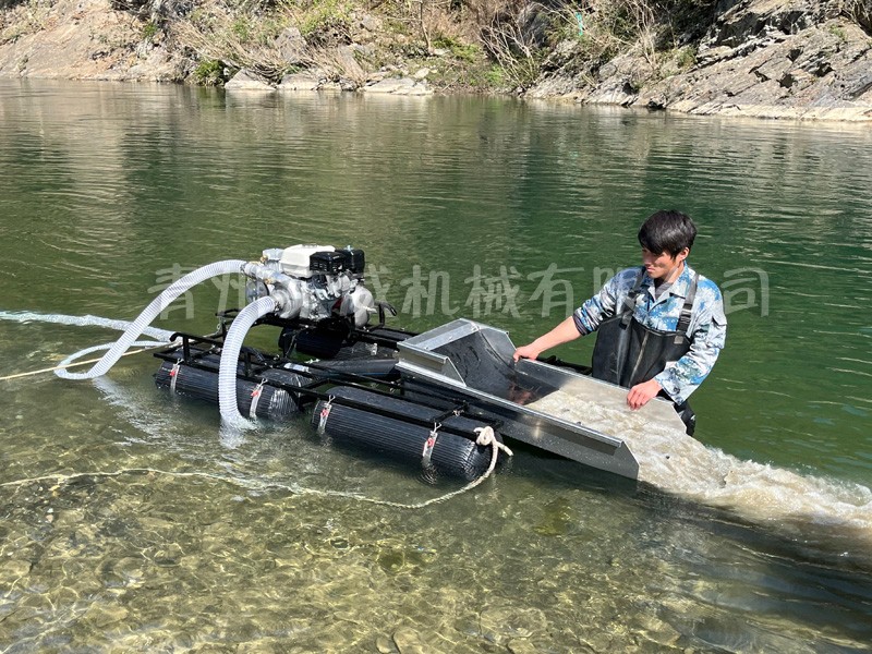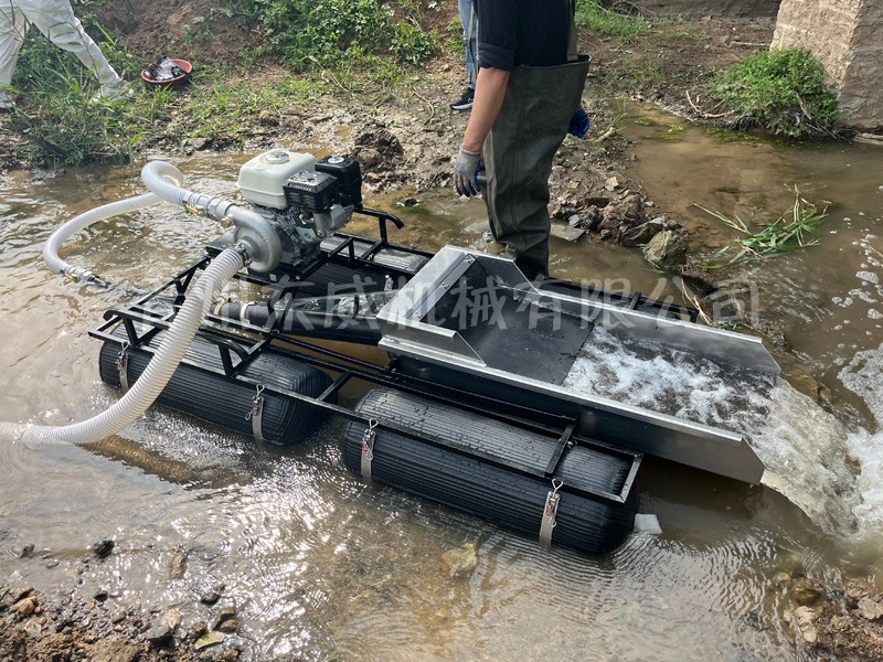 虹吸式淘金船是由機器、高壓水泵、浮體、射流嘴、管路、選礦溜槽等構成,具有體積小、輕量化、便于拆裝運輸?shù)忍攸c,是沙金采選行業(yè)內(nèi)投資少、見效快的新選擇;可選裝空壓機系統(tǒng),潛入水下進行探礦、選礦操作。