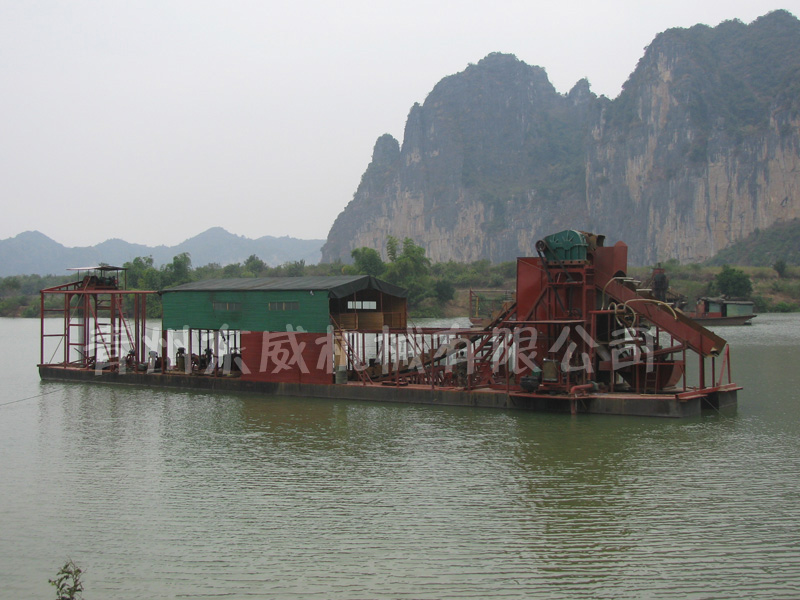 淘金船是一種集采礦作業(yè)、選礦作業(yè)為一體的水上聯(lián)合工廠,是一種砂金、鐵粉、錫礦、鎢礦等重金屬開采設(shè)備,它包括鏈斗挖掘系統(tǒng)、選礦及供水系統(tǒng)、廢礦及尾礦排棄系統(tǒng)、甲板機(jī)械、船體、上部鋼構(gòu)、供電等幾個(gè)基本系統(tǒng)。
